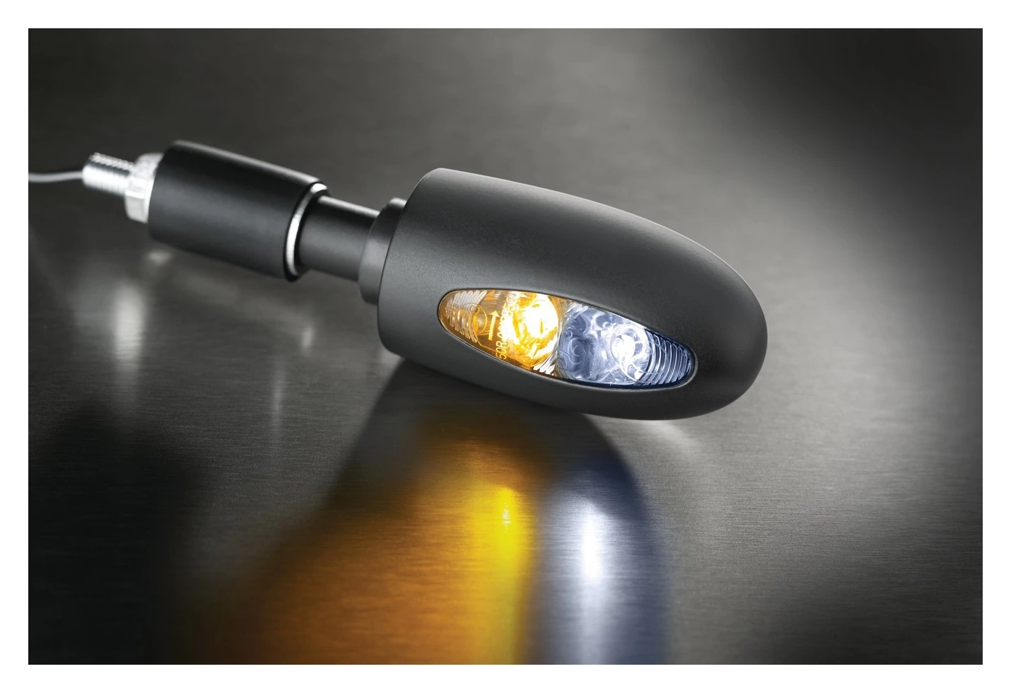 Bar-end turn signals have never been this stylish, or functional. The Kuryakyn by Kellermann BL 1000 integrates ultra-bright white L.E.D. running lights and amber L.E.D. turn signals in a sturdy aluminum housing that also helps dampen handlebar vibration. The amber turn signal is visible from the front and rear of the motorcycle, depending on handlebar width.