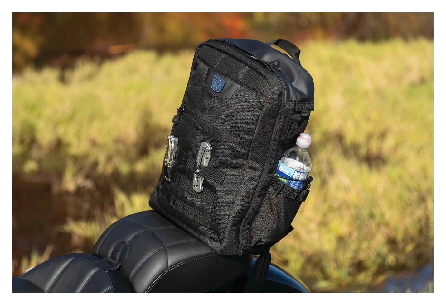 The Runaway Backpack has plenty of room for cherry bombs or whatever else you need to dip out in a hurry! This pack is durable, lightweight and designed for minimalist travelers seeking more than the basic backpack offers. Perfect for use as a daily commuter bag or on your motorcycle, with a host of rider-friendly features including partially detachable shoulder straps with designated storage sleeve, integrated sissy bar/trolly strap, MOLLE attachment points, a hydration bladder pouch with pass-through and more.