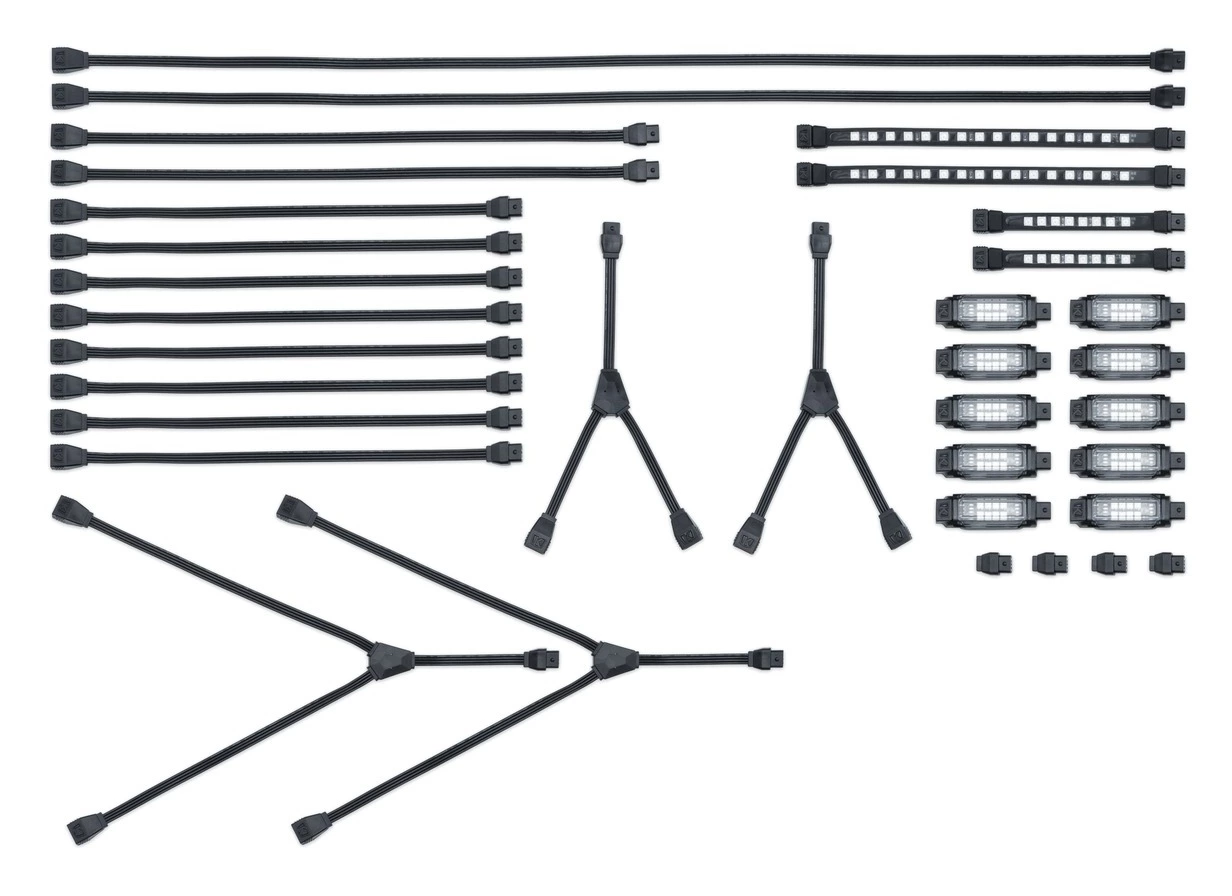 - Ten Prism+ Light Pods, two 4” Flex-Strip Lights, two 8” Flex-Strip Lights, eight 9” Extension Wires, two 12” Extension Wires, two 24” Extension Wires, two Short Y-connectors, two Long Y-Connectors, On/Off switch, zip ties, alcohol pads & dielectric grease (kits are offered with or without V2 Prism Bluetooth Controller)