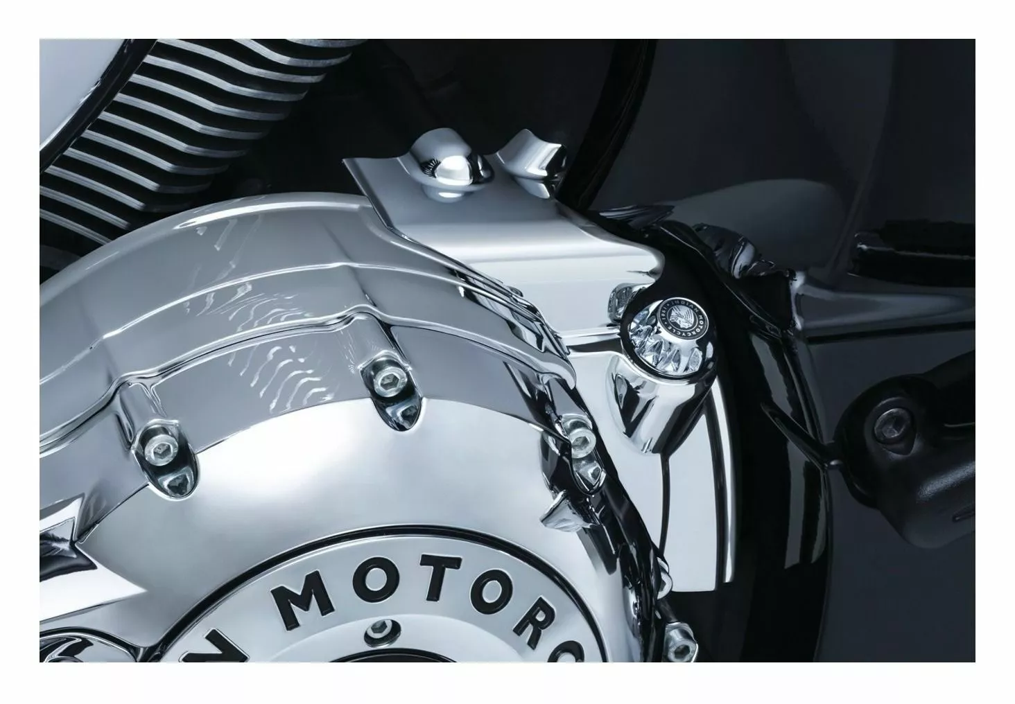 The Rear Oil Panel Accent for Indian models is a classic smooth chrome cover that surrounds the oil filler cap and converts the boring wrinkle black base of the motor to a gleaming chrome finish.