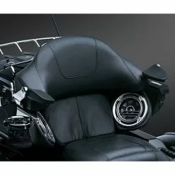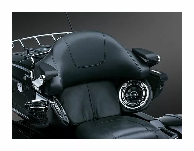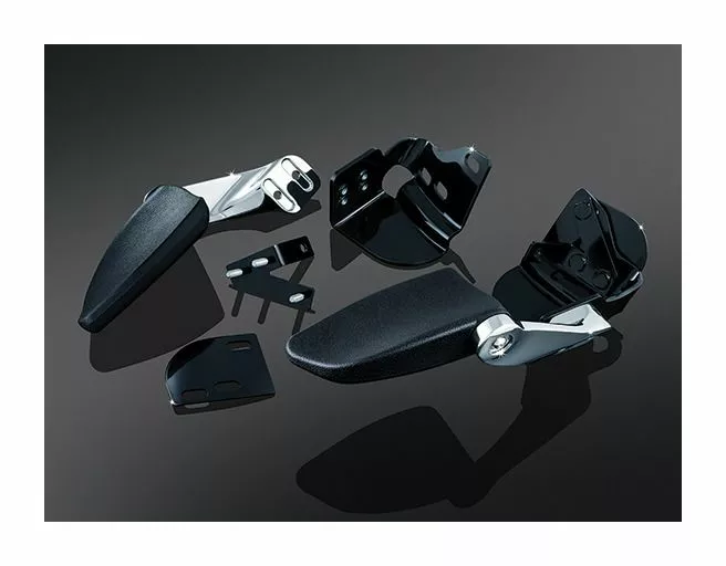 Ultimate comfort and convenience in a compact, sturdy package. Support brackets are nearly invisible and fasten between Tour-Pak lid and pad. Each arm has two mounting locations with adjustable stops at the pivot for fine tuning pad position. Padded over-molded arm folds back out of the way for a stealth look.