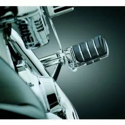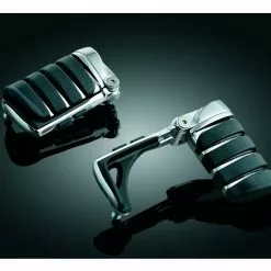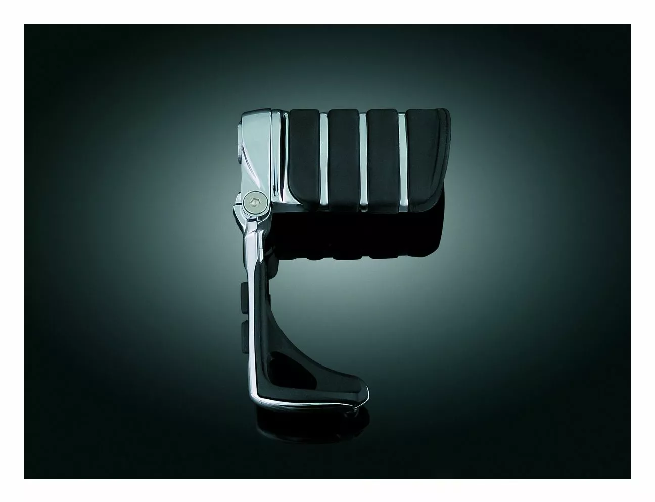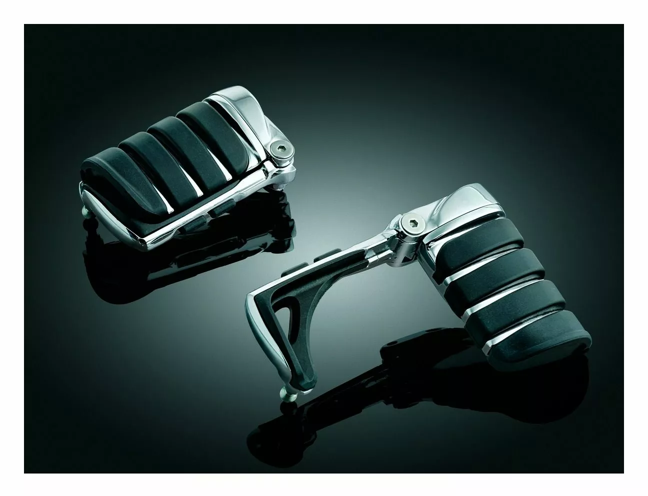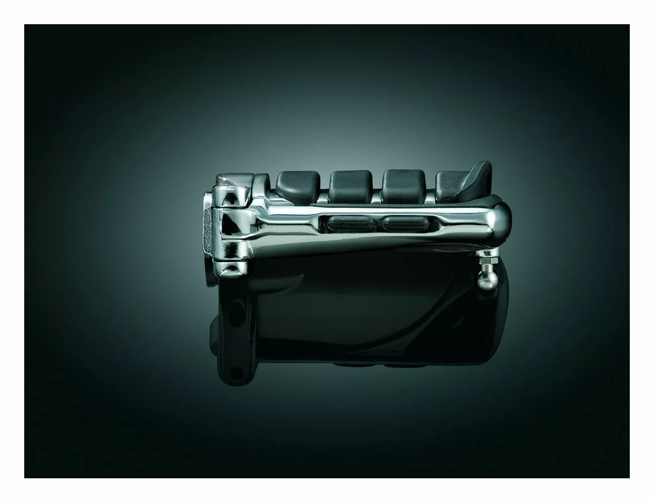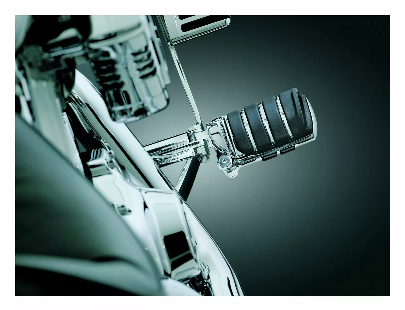 Switchblade Footpegs are sleek, versatile, and supremely comfortable. In their standard compact mode, they are a large-surface-area, rubber-isolated footpeg. Deploy the concealed heel rest and now you have the added fatigue-fighting comfort of the famous Kuryakyn ISO Stirrups. Although this setup will work in any peg location, these are the ideal footpegs for bikes using forward controls or as forward-mounted cruise pegs.