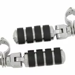 These pegs offer an incredible amount of adjustability and comfort. The entire assembly can be moved up or down on the engine guard depending on the rider height and desired foot position. The unique clevis also permits angle adjustment of the foot-peg. Recommended for use on any bike that has 1″ diameter engine guards.