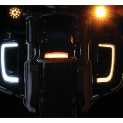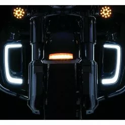 These fairing lower grills are intense, fully diffused L.E.D. lights with full-time white running lights and amber switchback turn signals when activated. Significantly enhance your front end’s styling and visibility toward oncoming motorists with these direct snap-in replacements for the black plastic radiator grills or filler plates on late-model H-D fairing lowers.